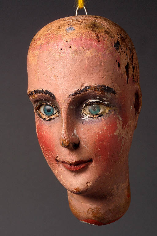 Testa scolpita, incarnato chiaro, occhi di pasta vitrea. Alla testa era applicata la parrucca.