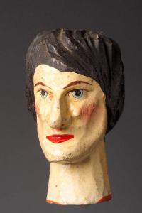 Testa tornita e scolpita con incarnato chiaro capelli dipinti di nero e labbra rosse. Occhi dipinti.