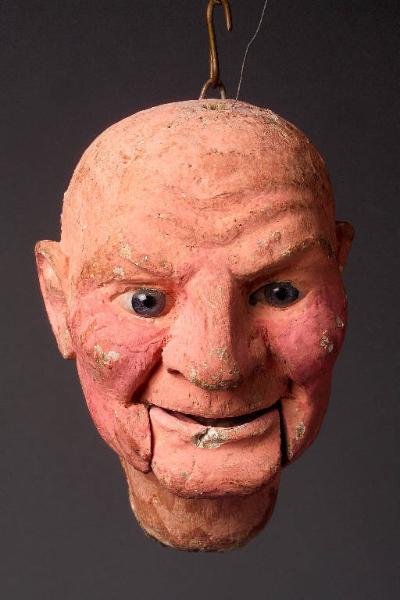 Testa scolpita e dipinta. La dipintura originale è stata sostituita con colore chiaro, occhi di vetro, bocca mobile. Integro non funzionante.