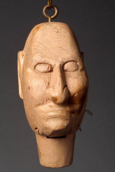 Testa grezza levigata a cui manca il colore. Collo mobile che consente il movimento. Alla nuca e alla gorgera sono applicate viti e un chiambretto per i fili. Integro non funzionante.