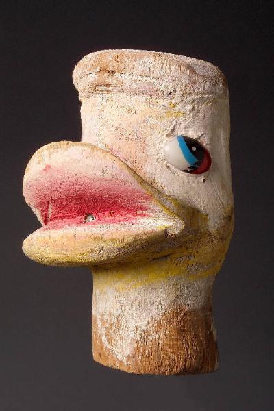 Testa dipinta di bianco con occhi in vetro inseriti successivamente. Il becco è dipinto, all'interno di rosso. Di fattura estremamente primitiva. Integro funzionante.