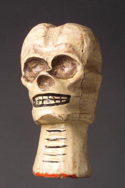 Testa tornita a forma di teschio colorata di bianco. La cavità nasale e quelle oculari sono molto vicine e colorate di marrone scuro. Denti e bocca disegnati e di forma quadrata. Il collo, con strisce scure parallele sotto il mento, termina con pittura rossa. Integro funzionante. Integro funzionante.