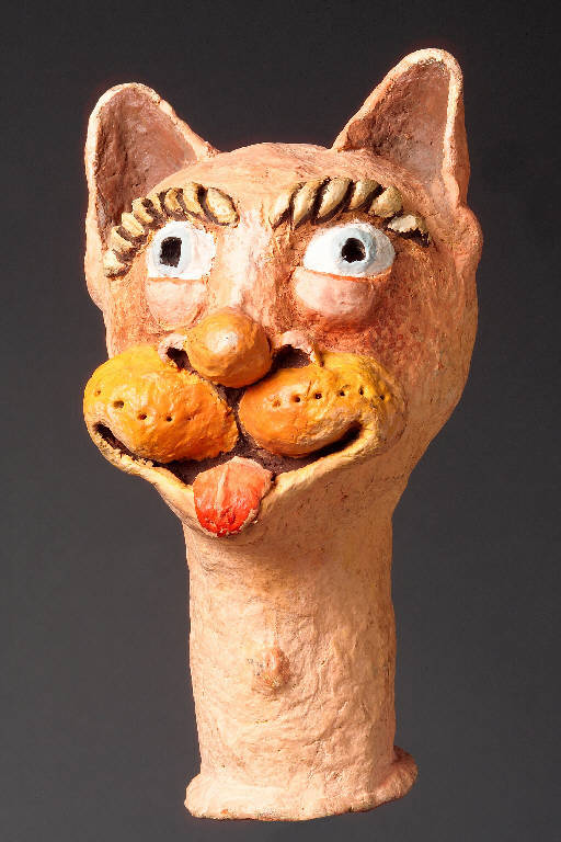 Testa modellata dipinta di rosa somigliante alla caricatura di un felino, orecchie in rilievo triangolari, sopracciglia in rilievo di colore scuro, occhi bianchi grandi con pupilla forata e colorata di scuro. Naso a patata e muso allungato terminante con baffi, bocca e lingua protusa di colore rosso. Lungo il collo.\nIntegro funzionante.