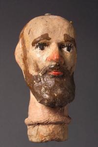 Testa modellata, incarnato chiaro, senza capelli con basette, sopracciglia, occhi dipinti. La folta barba, di colore marrone, termina a punta. Il naso termina con una coloritura rossa. Bocca con labbra chiuse rosse. Alla parte superiore della testa è stata aggiunta una vite . Integro funzionante.