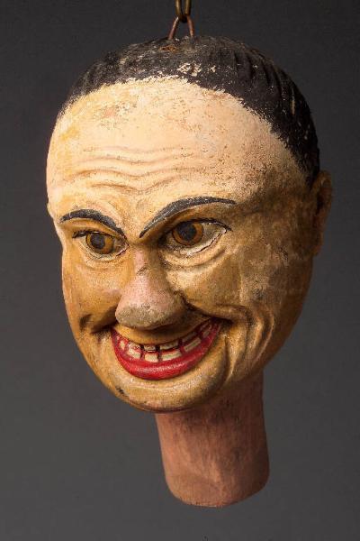 Testa scolpita, forma arrotondata, adattata a marionetta. Capelli intagliati dipinti di colore marrone. Incarnato chiaro, occhi e sopracciglia scolpiti e dipinti, bocca sorridente con rughe d'espressione e labbra dischiuse rosse. Denti incisi bianchi. Gancio alla sommità del capo. Integro non funzionante.