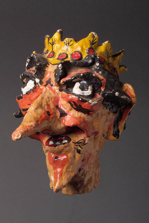 Testa dipinta su cui è modellata una corona di colore giallo con punti rossi.Sopracciglia e occhi di colore marrone in rilievo contornate da occhiaie in rilievo di colore rosso. Naso lungo di forma conica, zigomi rossi pronunciati; mento triangolare che termina a punta, dipinto di rosso. La bocca è piccola con labbra rosse e i denti sono disegnati nella parte interna delle labbra. Integro funzionante.