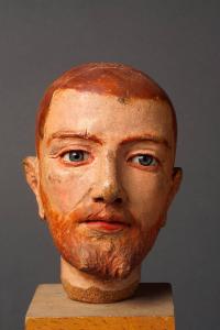 Testa scolpita molto finemente con capelli e dipinti di rosso. Incarnato chiaro. Occhi di vetro di colore azzurro. Sopracciglia, barba e baffi intagliati. Collo di dimensioni ridotte con applicato un piedistallo di legno. Integro funzionante.