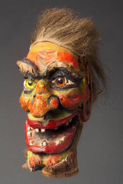 Testa scolpita policroma. Capelli di crine e inserti di pelo animale come sopracciglia fissati con chiodi. Orecchie molto evidenti. Cavità oculari scolpite a cui sono stati appicati occhi di vetro, il sinistro di colore giallo e il destro marrone. Zigomi pronunciati con strati di colore verde e arancio, grande bocca aperta con labbra rosse. All'interno delle fauci sono stati intagliati denti irregolari bianchi. Mento con barba divisa in due con inserti di pelo animale applicati. Integro funzionante.