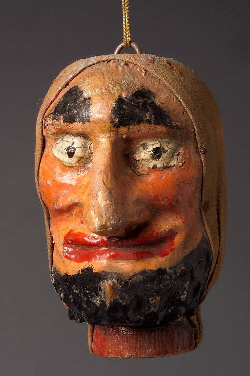 Incarnato piuttosto scuro, cuffia di tessuto color mattone sulla testa, espressione grottesca con occhi spalancati. Bocca chiusa ghignante e labbra rosse. Soppracciglia dipinte, barba scolpita e dipinta di nero terminante a punta. Integro non funzionante.