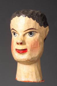 Figura maschile, testa tornita con incarnato chiaro, labbra rosse e capelli scolpiti marroni. Utilizzabile per burattini e marionette giocattolo, occhi dipinti di azzurro.