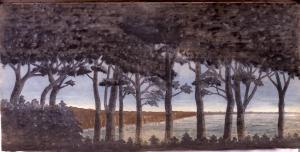 Il fondale è inchiodato ad un bastone di sezione circolare o quadrangolare mediante chiodi e pezzeti di cuoio salvatela. Sul retro è dipinto un lago.