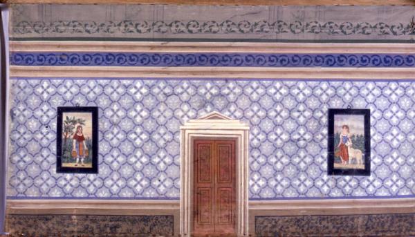 Il fondale è inchiodato ad un bastone di sezione circolare o quadrangolare mediante chiodi e pezzeti di cuoio salvatela. Il fondale è dipinto su entrambi i lati. Sul retro è raffigurato un interno.