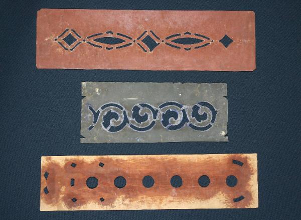 I cartoni per trasposizione, realizzati in cartoncino disegnato e ritagliato secondo un motivo decorativo, venivano utilizzati per creare decorazioni all'interno delle scenografie, consentendo di riprodurre in serie il motivo ornamentale. La prima mascherina è realizzata con una greca che alterna rombi a ellissi molto schiacciate; la seconda presenta un motivo decorativo a girali vegetali; il terzo è una serie di sei cerchi con ai lati dei piccoli elementi geometrici di contorno.