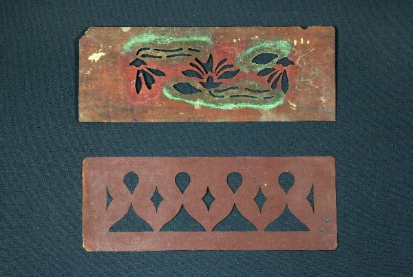 I cartoni per trasposizione, realizzati in cartoncino disegnato e ritagliato secondo un motivo decorativo, venivano utilizzati per creare decorazioni all'interno delle scenografie, consentendo di riprodurre in serie il motivo ornamentale. La prima mascherina ha un disegno raffigurante tre fiori mentre la seconda è una greca con motivi a goccia e triangolari alternati da rombi.