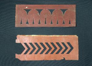 I cartoni per trasposizione, realizzati in cartoncino disegnato e ritagliato secondo un motivo decorativo, venivano utilizzati per creare decorazioni all'interno delle scenografie, consentendo di riprodurre in serie il motivo ornamentale. La prima mascherina presenta due file di triangoli di dimensioni diverse e rivolti in senso opposto; la seconda raffigura una serie di frecce poste tutte verso la stessa direzione.