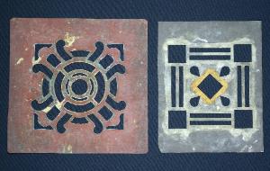 I cartoni per trasposizione, realizzati in cartoncino disegnato e ritagliato secondo un motivo decorativo, venivano utilizzati per creare decorazioni all'interno delle scenografie, consentendo di riprodurre in serie il motivo ornamentale. La prima mascherina presenta una decorazione geometrica con cerchi concentrici inscritti in un quadrato; la seconda presenta motivi geometrici realizzata con quattro quadrati agli angoli che, collegati con linee rette, formano un quadrato al centro del quale si trova un rombo con quattro elementi a goccia.