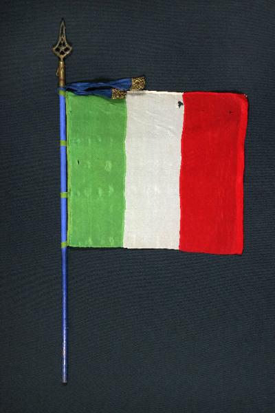 Bandiera italiana di seta bianca, rossa e verde con le tre strisce cucite in senso longitudinale. E' fissata all'asta mediante quattro fascette di stoffa verde fermate da borchie di ottone. Nastro di seta blu con fiocchi di passamaneria oro. Asta di legno dipinta di blu con parte terminale di ottone e punta di ottone lavorato.