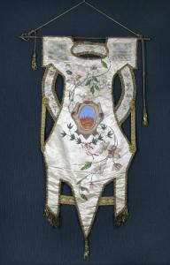Stendardo della città di Salsomaggiore realizzato in seta bianca con applicazioni ai lati di seta azzurra con ricami floreali rosa. Lo stendardo è interamente bordato con passamaneria laminata oro; nella parte inferiore sono ritagliate delle punte alle quali sono cuciti un fiocco e della frangia di passamaneria oro. Al centro è dipinto lo stemma di Salsomaggiore, il simbolo è coronato ed ha inserito nella cornice una salamandra a sua volta incoronata e circondata da fiamme. Intorno sono dipinti fiori e racemi verdi. Vi è la scritta dipinta "Città di Salsomaggiore" ed è visibile la firma dell'autore "Ettore (...) nari". Sono presenti altre scritte molto sbiadite e di difficile lettura.