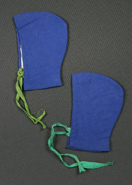 Due cappucci di tessuto blu con fodera bianca e due legacci verdi cuciti.