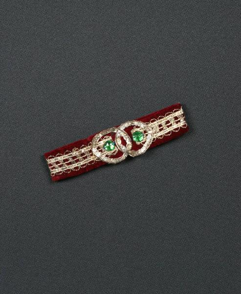 La cintura è di velluto rosso vermiglione con decorazione di passamaneria argento, fregio di paillettes argento e due strass di vetro verde.