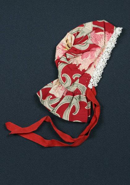 La cuffia è di cotone stampato a motivo floreale su fondo rosso: al bordo inferiore è cucita una rouche dello stesso tessuto. La fodera della cuffia è di cotone giallo ed ha un bordo di pizzo bianco. Del traversino rosso è cucito sui lati in modo da fissare la cuffia alla testa del burattino.