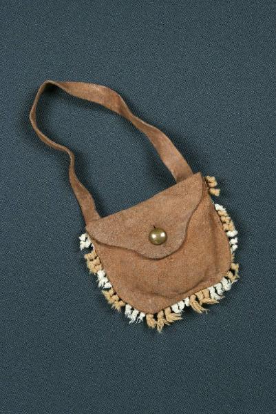 Borsa di pelle marrone con bottone metallico cucito sul davanti e nel quale si abbottona l'asola tagliata nella parte superiore. Lunga tracolla di pelle marrone e bordo decorato con passamaneria di cotone e piccoli fiocchetti bianchi e marrone. Nella borsa è inserita un'imbottitura di ovatta.