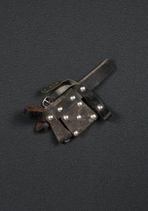 Briglia con sottopancia di cuoio nero con borchie metalliche; laterali di cuoio ai quali è applicata una catena di ferro.