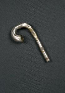 Corno, o trombetta, di metallo argentato ricurvo ad un'estremità; beccuccio svitabile e ancia di metallo interna che produce realmente un suono.