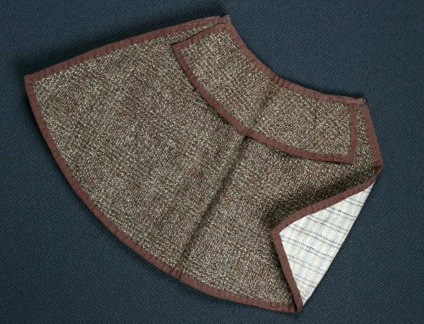 Il mantello è di lana marrone con fodera di cotone a quadri. E' presente una breve mantellina con fodera simile bordata con traversino marrone. Il bordo inferiore è arrotondato.