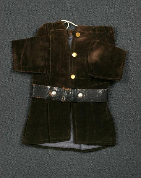 L'abito è di velluto marrone con fodera grigia; cordoncino bianco nel bordo superiore per il fissaggio a coulisse. Presenta un'apertura sul davanti in parte cucita sul petto e una cintura in vita di finta pelle nera con due piccole borchie di metallo; termina con tre bottoncini dorati sul davanti.