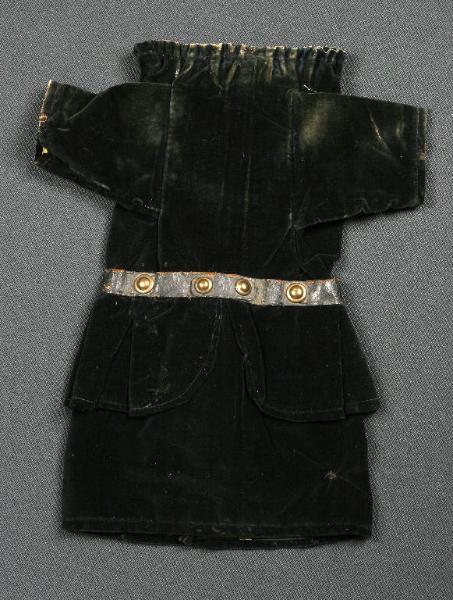 L'abito è di velluto nero con fodera di cotone nero a disegni stampati. Nel bordo superiore ha un cordoncino bianco per il fissaggio a coulisse. Presenta falde della giacca cucite in sovrapposizione e cintura in vita di pelle nera con borchie metalliche.