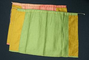 Il primo mantello è di tessuto rosa, in parte foderato con tessuto giallo. Il secondo è di tessuto verde in parte foderato con tessuto giallo. Entrambi presentano un cordoncino nel bordo superiore per il fissaggio a coulisse.