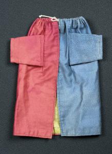 Veste di cotone blu e rosso con fodera di cotone giallo; nel bordo è inserito un cordoncino per il fissaggio a coulisse.