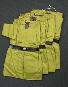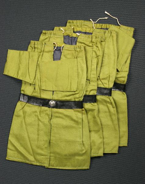 Quattro abiti di cotone verde con fodera grigia. In vita presentano una cintura cucita di finta pelle nera chiusa da una borchia metallica. Nell'orlo superiore è cucito un cordoncino che consente il fissaggio al collo.