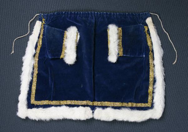 Cappotto di velluto blu con fodera chiara, bordato all'intorno e ai polsi con pelliccia di lapin bianca. Decorazione all'intorno e ai polsi con nastro laminato oro. Nell'orlo superiore è inserito un cordoncino che consente il fissaggio al collo del burattino.