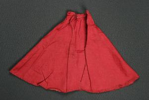 Il mantello di cotone rosso è sfoderato ed è più stretto al collo e più largo alla base.