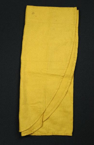 Il mantello è di cotone giallo sfoderato con il bordo stondato.