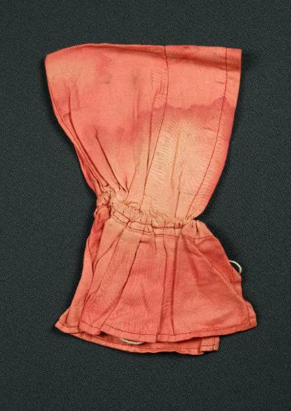 Cappuccio di cotone arancione in parte foderato con cotone rosa. Alla base del cappuccio è cucita una breve mantellina con inserito un cordoncino per il fissaggio a coulisse.