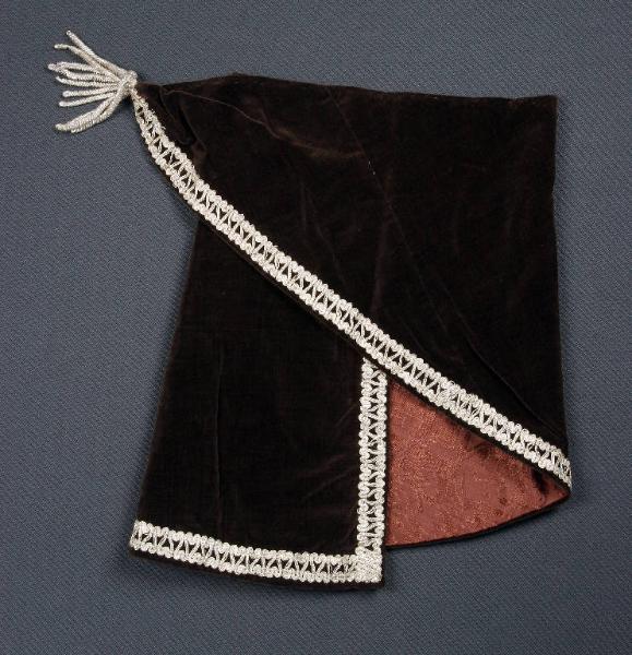 Mantello di velluto marrone a forma triangolare con bordo inferiore stondato, fodera di tessuto marrone operato. Il bordo presenta su due lati una passamaneria argento e fiocco di passamaneria argento ad una estremità.