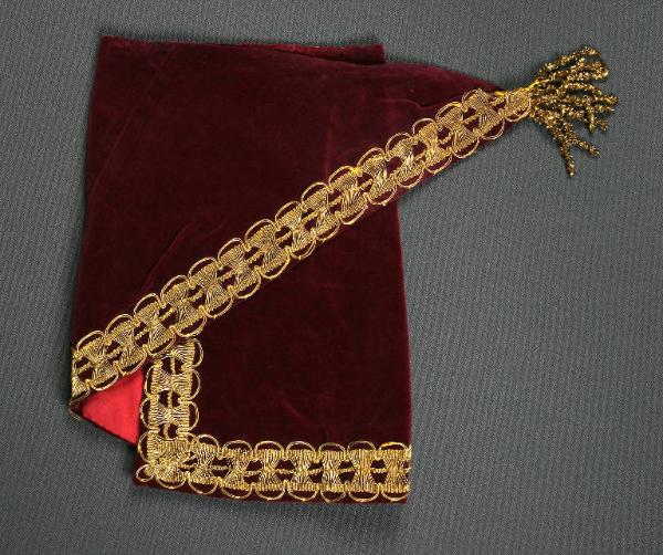 Mantello di velluto bordeaux a forma triangolare con bordo inferiore stondato, fodera di tessuto dello stesso colore. Il bordo è decorato con passamaneria argento e fiocco di passamaneria a frange ad una estremità.