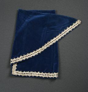 Mantello di velluto blu a forma triangolare con bordo inferiore stondato, fodera di cotone dello stesso colore. Il bordo è decorato con passamaneria argento.