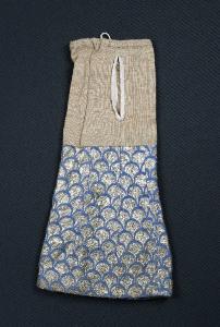 La veste è bipartita e la parte superiore di juta presenta due aperture per le braccia bordate con nastrino bianco di cotone; la parte inferiore di tessuto laminato oro e argento su fondo azzurro ha la fodera di cotone beige.