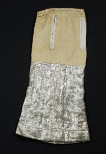 La veste è bipartita e la parte superiore di canapa presenta due aperture per le braccia bordate con nastrino bianco di cotone. La parte inferiore è di tessuto laminato argento con fodera beige; in alto sul bordo è inserito un cordoncino per il fissaggio a coulisse.