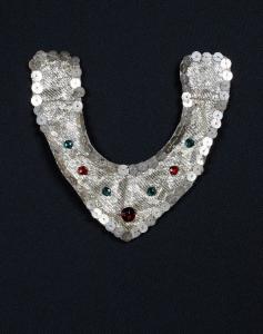 Collare di tessuto laminato argento di forma ovale, con fodera beige. E' bordato con nastrino grigio sul quale sono applicate paillettes di metallo; sul davanti sono cucite sette pietre, di cui sei piccole verdi e rosse e una più grande rossa.
