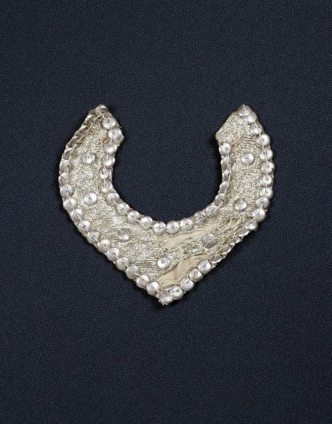Collare di tessuto laminato argento di forma ovale, con fodera di cotone. E' bordato e decorato con paillettes di metallo e termina a punta.