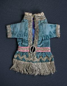 Giacca di velluto verde acqua con fodera di tessuto azzurro a disegni floreali viola. Il collo è bordato con nastrino verde e con pizzo bianco internamente. I polsi e i bordi sono decorati con passamaneria argentata, l'orlo con passamaneria argentata a frangia. In vita una cintura di seta rosa decorata con passamaneria argentata e con una fibbia ovale di metallo e strass cucita su velluto nero; al centro una decorazione rettangolare di strass.
