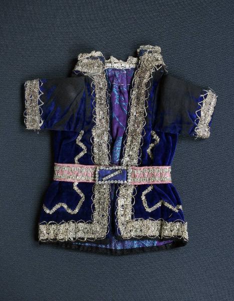 Giacca di velluto blu con fodera di tessuto viola a disegni floreali azzurri. Il collo è bordato con nastrino blu e con pizzo bianco internamente. E' bordata e decorata con passamaneria argentata. In vita una cintura di seta rosa decorata con passamaneria argentata e con una fibbia rettangolare di metallo e strass cucita su seta blu. Al centro una barretta rettangolare di strass. L'orlo inferiore è bordato con nastrino nero.