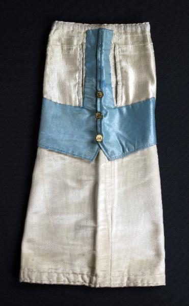 Veste di seta avorio con fodera di tela bianca. In sovrapposizione è cucito un gilet di seta azzurra con fodera di tela bianca, con tre bottoni di metallo bianco smaltato decorati in metallo dorato. Il bordo superiore e le aperture per le braccia sono rivestiti di traversino bianco; nell'orlo è inserito un cordoncino per il fissaggio a coulisse.