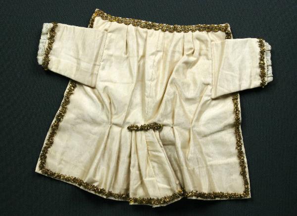 Giacca di seta avorio con fodera gialla; al collo è fissato un nastrino bianco sul quale è cucita una passamaneria dorata. Intorno è applicata una decorazione con filo laminato oro che funge anche da martingala e borda anche i polsi, ai quali è cucito un pizzo bianco internamente. Sul dietro la giacca presenta un'arricciatura all'altezza della vita.