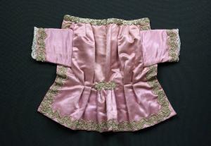 Giacca di seta rosa con fodera di cotone bianco. Al collo, ai polsi e all'intorno è applicata una decorazione di passamaneria argentata utilizzata anche per la martingala. All'interno dei polsi è cucito un pizzo bianco e sul dietro la giacca presenta un'arricciatura all'altezza della vita.